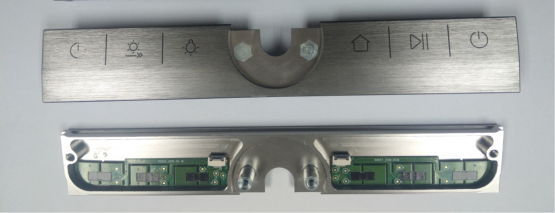 下图是卡萨帝指挥家系列金属按键的正反面照片,位于金属面板后面的2块PCB就是源自瑞湖科技的压力感应器,客户只需要将它用双面胶贴在金属面板后面,就可实现压力检测。